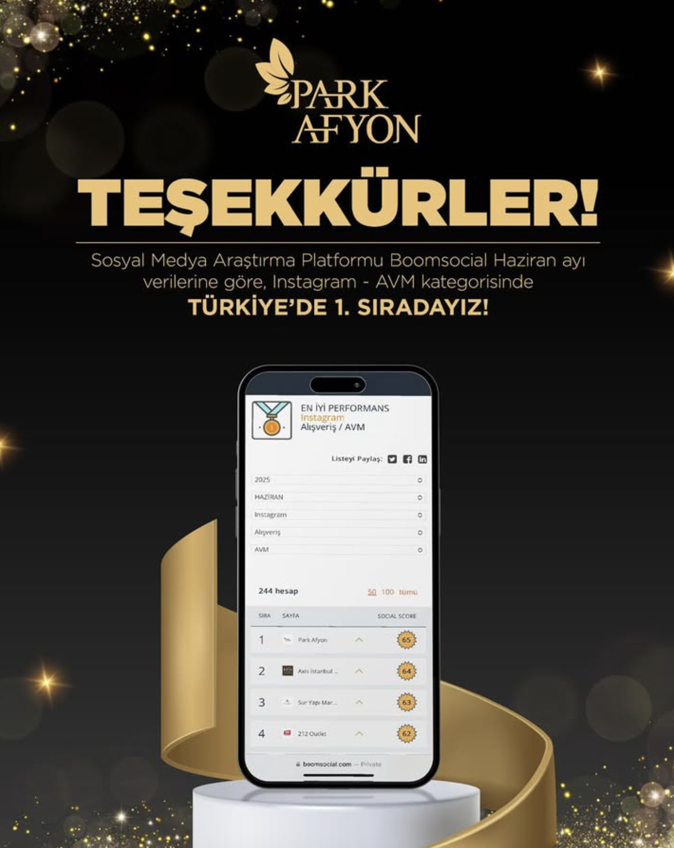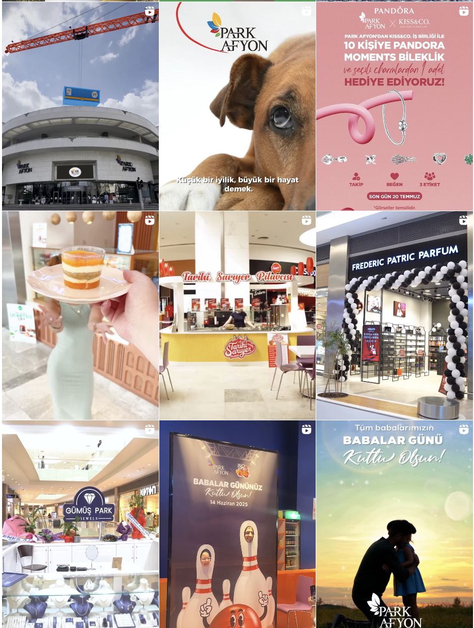 Uzun süredir sosyal medya yönetimini üstlendiğimiz Park Afyon AVM, Boom Social ölçüm sistemine göre Nisan 2025 ve Haziran 2025 aylarında Türkiye’de tüm AVM’ler arasında erişim ve etkileşim birincisi oldu. Reels videoları ve tüm içerik üretimleri MARK-A ekibimiz tarafından hazırlanarak, markanın dijital dünyada zirvede kalması sağlanıyor.